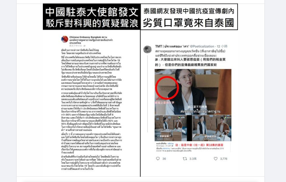 專門翻譯泰國時事的粉絲專頁「泰譯聞 นักแปล กระแสไทย-ไต้หวัน」發文指出,面對泰國在野黨對科興疫苗的質疑,中國駐泰大使館大動作發文,直指各種對科興的質疑都是不公允的,並且強調科興的效力,也呼籲有心人士不要破壞中泰關係,科興就是中國對泰國的善意,中泰一家親、中泰兄弟情。