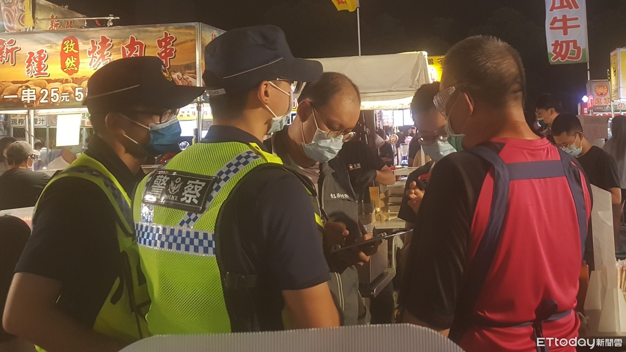 ▲台南市衛生局會同經發局市場處及警察局,至大東夜市稽查並加強防疫宣導,共稽查40家攤商,其中2家無梅花座及隔板,依法移送裁罰。(圖/記者林悅翻攝,下同)