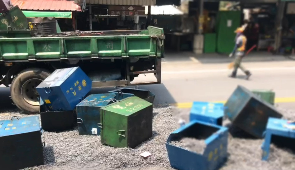 ▲▼貨車撞到婦人後急煞車,車上載運的螺絲桶掉落砸到其他車輛。(圖/記者洪靖宜翻攝,下同)