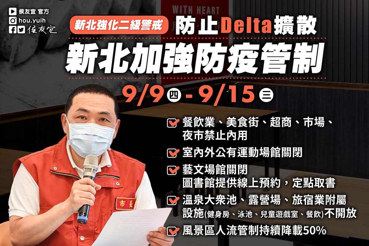 為防堵Delta病毒擴大,侯友宜已宣布強化二級警戒、加強防疫管制,自9月9日至9月15日,餐飲業、美食街、超市、市場、夜市「禁止內用。戶外活動部分,關閉各項運動場所,包括運動中心、運動聚點、體育館;室外部分,關閉棒壘球場、籃球場、網球場、足球場、溜冰場、田徑場。