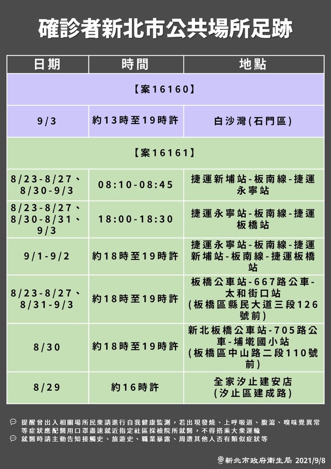 衛生局進一步公布足跡,案16161多次搭乘捷運往返新埔、永寧站,也曾搭過667路公車、705路公車;案16158、16160、16161、16162則曾多次搭乘捷運板南線、淡水信義線,前往台大醫院站、台北車站,最遠的足跡則是9/5有確診者曾搭乘太魯閣227車次,從花蓮火車站到板橋火車站。