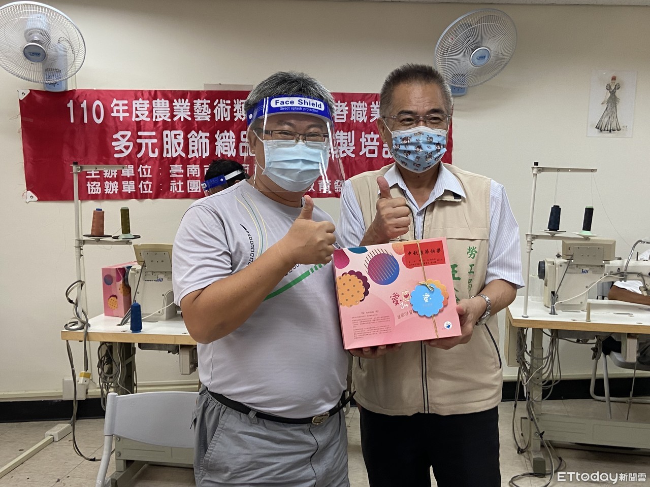 疫情趨緩下台南市政府勞工局委託社團法人中華職訓教育發展協會辦理「2021年度農業藝術類身心障礙者職業訓練-多元服飾織品拼貼縫製培訓班」,8日舉行開訓典禮,恢復實體訓練課程,勞工局局長王鑫基,特代表市長帶月餅致贈給學員。