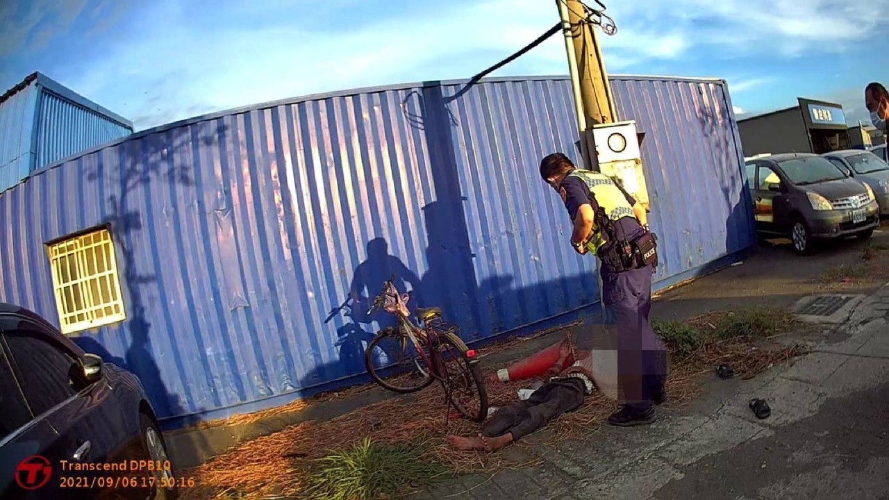 烏日警分局龍津派出所警員王偉穎及顏熙哲,日前獲報有1名男子路倒在龍井區臨港路二段42號電線桿附近,員警立即驅車前往協助,發現蘇男骨瘦如柴、全身沾滿沙子、落葉,衣褲髒污,有如遊民,更令人驚訝的是,蘇男從梧棲家中騎乘自行車出門,中午行經龍井區時身體不適躺在路旁,直到下午將近6點才被路人報案,整個下午滴水未進。