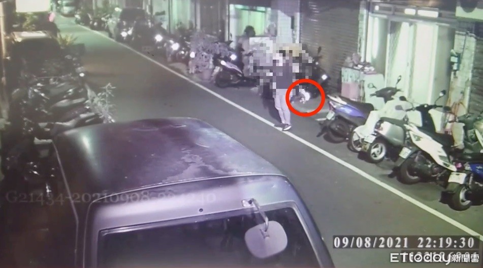 ▼陳男等4人騎機車2度朝自家大門丟鞭炮(紅圈處) 。(圖/記者陳以昇翻攝)