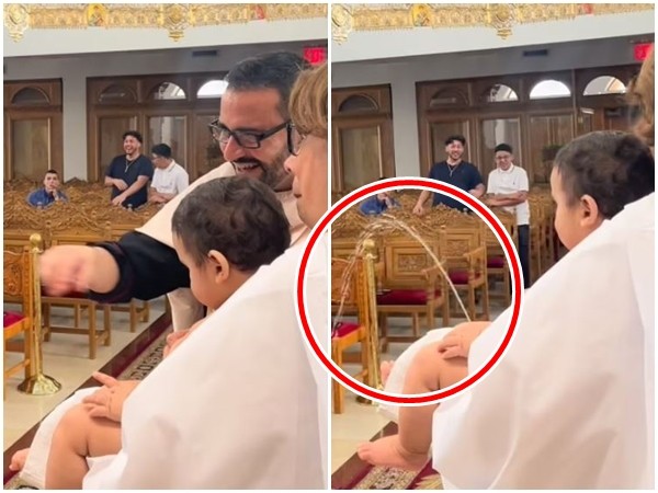 根據《紐約郵報》報導,紐約皇后區35歲的藥師李柏拉托(Demetri limberatos)日前在IG上傳一段影片寫道,「小喬納森(Jonathan)整個尿在牧師身上。」其中拍到7個月大的兒子喬納森在希臘教堂裡參加洗禮儀式,當時他全身赤裸地躺在一名中年婦人手中,正臉面對著牧師,沒想到,正當牧師準備將聖水灑在孩子身上時,小喬納森竟然開始排尿,小便瞬間變成一道噴泉,在空中畫出一條完美的拋物線,意外演變成嬰兒幫牧師受洗。