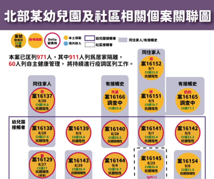 另外,昨天新增2名幼童的奶奶及外婆,案16165、16166,雖然非同住家人,但都是來探望孫子確診。而社區接觸者案16158為台大麻醉人員,而案16163、案16164為同棟大樓鄰居,是在做入院前陪病者採檢驗出。目前新北市已在做環境採檢與大規模快篩,相關居家隔離也在進行中。