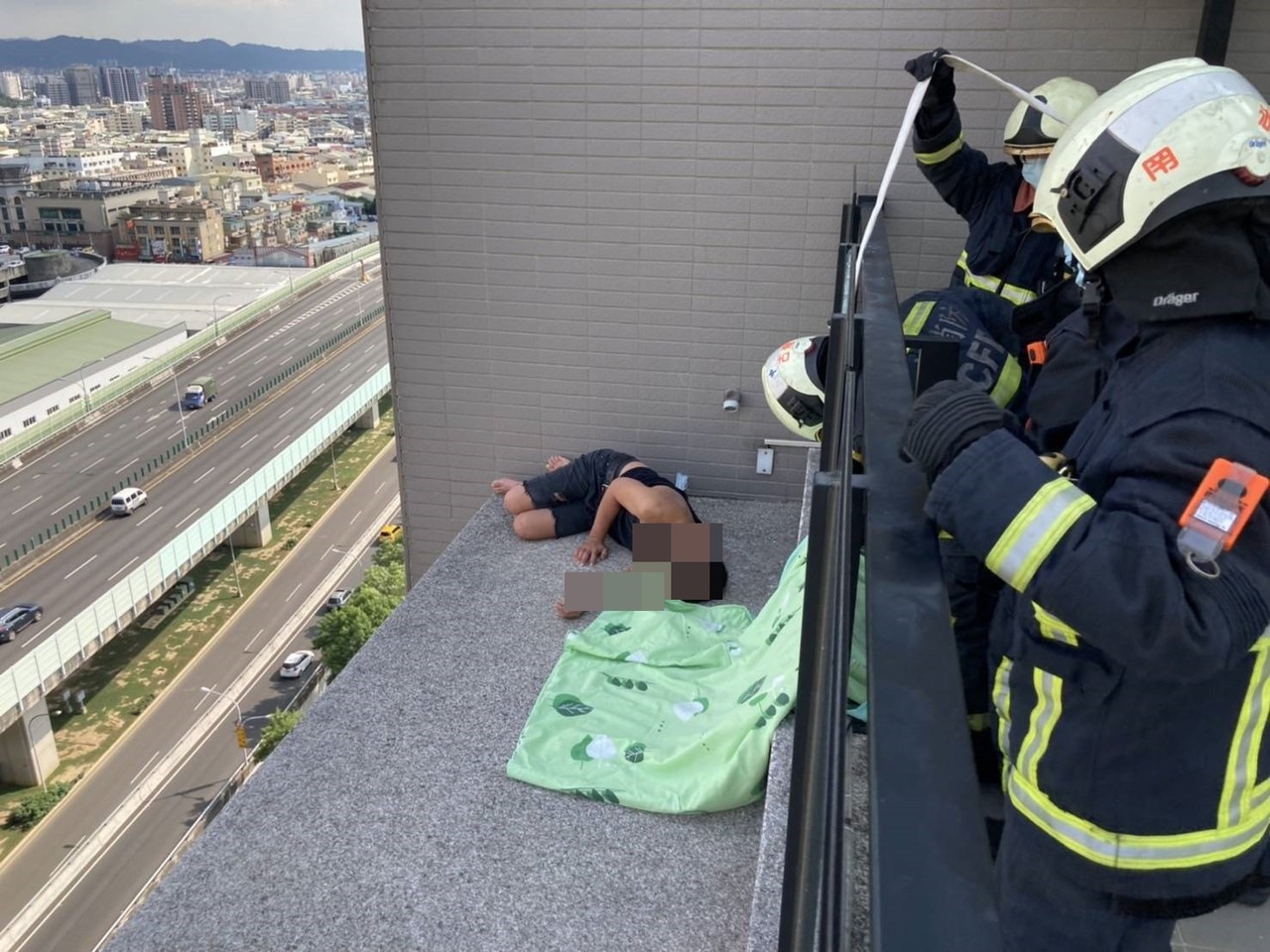 太平警分局新平所下午2點36分獲報後,轉報消防局中山分隊,派出消防車2輛、救護車1輛、人員9名,由中山分隊長何松財帶隊前往搶救,在該社區大樓15樓突出平口處發現酒醉男子躺臥在邊緣,相當危險,警消破壞強化玻璃後,3點03分順利救出,男子酒醒後表示不願就醫,交家屬帶回。