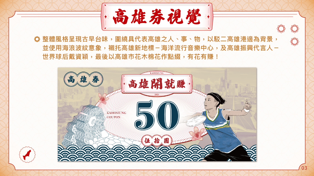 高市府今也同步正式曝光高雄券,全市通用的高雄券都是50元小面額,並透露本次高雄「開就賺」振興活動代言人就是世界球后戴資穎,特別將小戴打球的英姿融入高雄券的設計之中,也加入高雄流行音樂中心、市花木棉花等高雄元素。此次設計更是將戴資穎與此次東京奧運、帕奧選手們奮戰的精神與團結全臺灣的能量,作為後疫情時代振興方案的最好象徵。