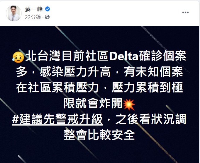 對於長榮機師確診、新北幼兒園群聚以及松山區某國中學生染疫連環爆,胸腔重症醫師蘇一峰今日在FB發文急呼籲,北台灣目前社區Delta確診個案多,感染壓力升高,有未知個案在社區累積壓力,壓力累積到極限就會炸開,「建議先警戒升級,之後看狀況調整會比較安全。」