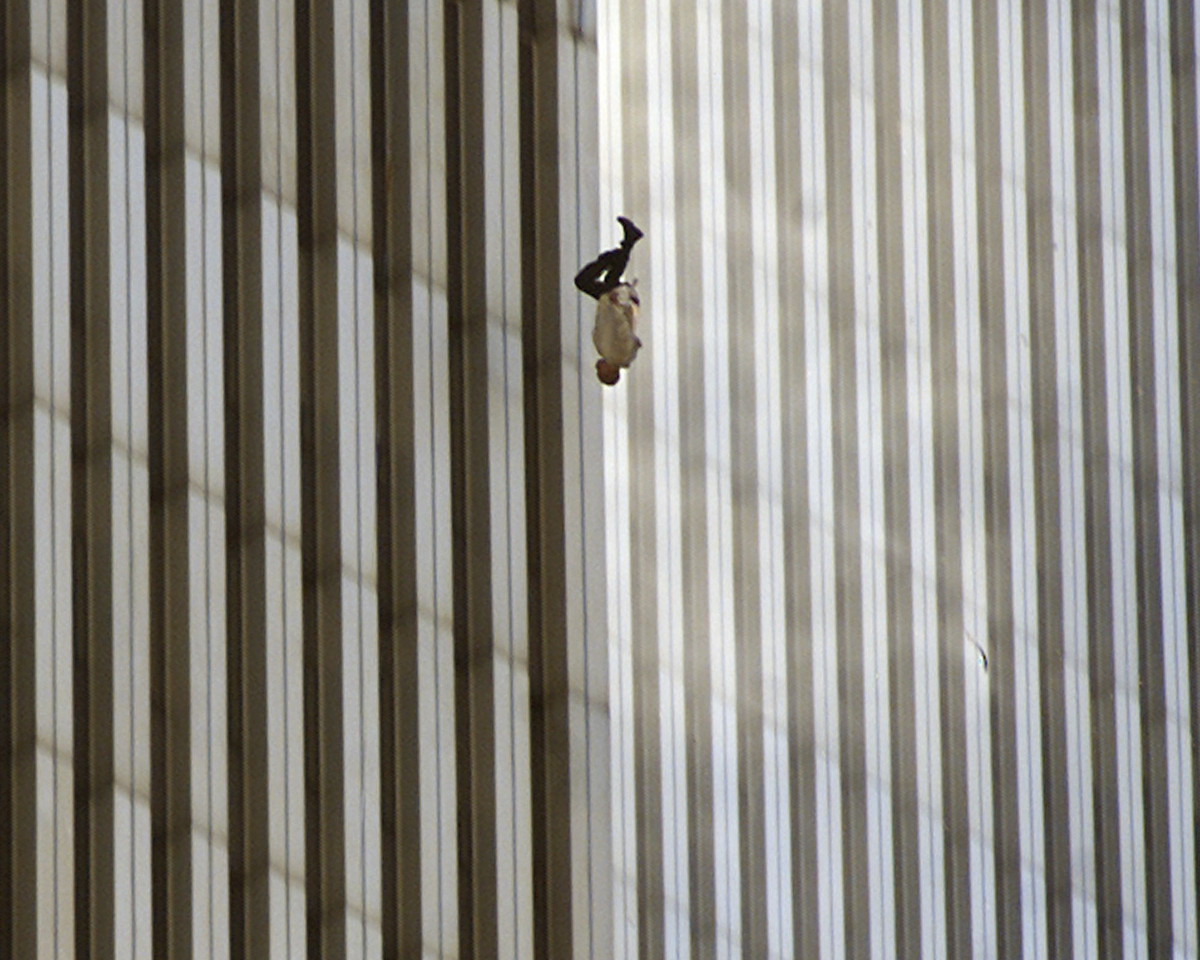 德魯拍下了一名穿著白色襯衫、深色西裝褲的男子,以頭下腳上姿勢從世貿中心跳樓的瞬間,這就是最經典的新聞照片「墜落男子」(Falling Man)。