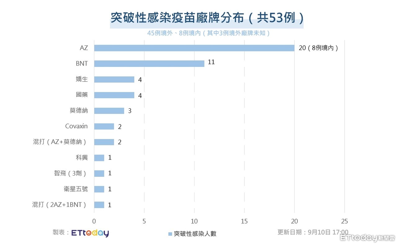 Delta病毒來勢洶洶,讓國人接種疫苗的意願大增。截至9月9日為止,全台已有53例「突破性感染」,其中包含8例本土病例以及45例境外移入,《東森新媒體ETtoday》也整理了突破性感染病例接種的疫苗廠牌,讓讀者一目了然。