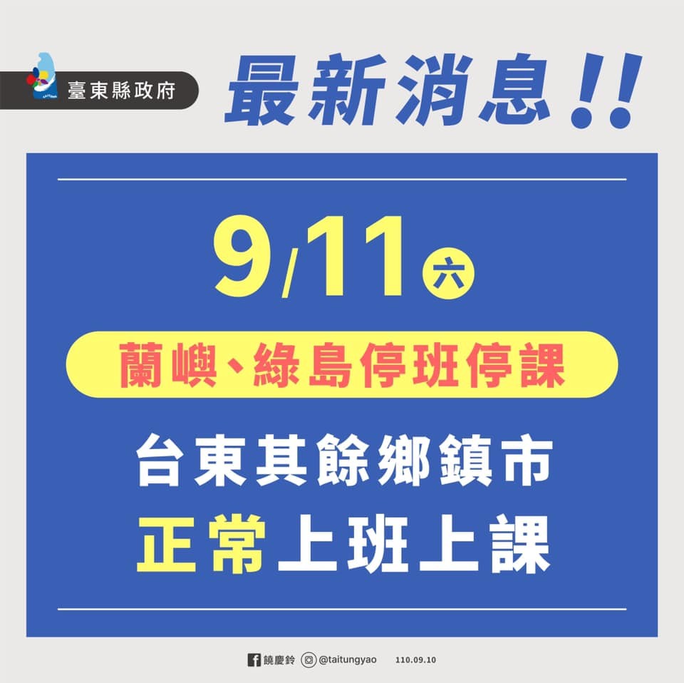 台東縣長饒慶鈴昨(10日)於臉書宣布,由於強烈颱風璨樹逼進台東,根據中央氣象局風雨預報資料,綠島及蘭嶼首當其衝,9/11(六)2離島停班停課,台東縣其他地區正常上班上課。