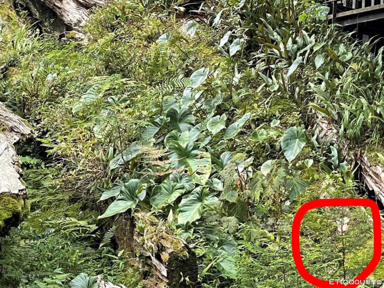 ▲倒下5年的溪頭千年紅檜神木,近日發現在附生植物中,長出二代樹苗(紅圈處)。(圖/胖胖樹王瑞閔提供,下同)