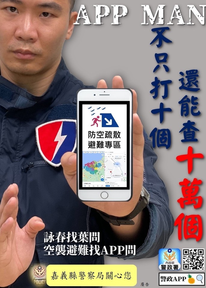 另為加強宣導民眾熟悉空襲避難地點,請民眾多加利用手機下載使用內政部警政署「警政服務APP-防空疏散避難專區」及上網「嘉義縣警察局-防空疏散避難專區」,並點選防空疏散避難設施位置Google Map或掃描QRcode查詢就近之防空避難處所。