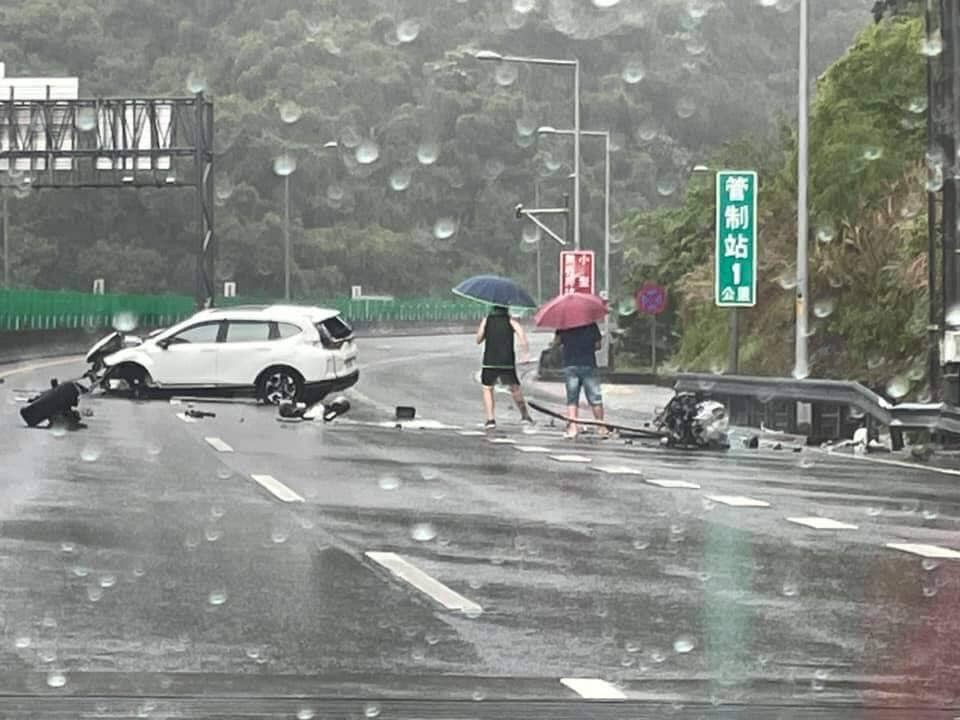 璨樹颱風挾豪雨來襲,宜蘭國道5號南下6.4K內側車道今(12日)上午10時許發生自撞翻車事故,一輛白色休旅車行經該路段時,疑似因天雨路滑,失控撞上護欄,強大的撞擊力道導致汽車引擎當場噴飛、輪胎也掉出;事後救護人員獲報到場,現場傷者2人(1男1女)皆無明顯外傷,後續送往萬芳醫院治療,確切事故原因仍待進一步調查釐清。