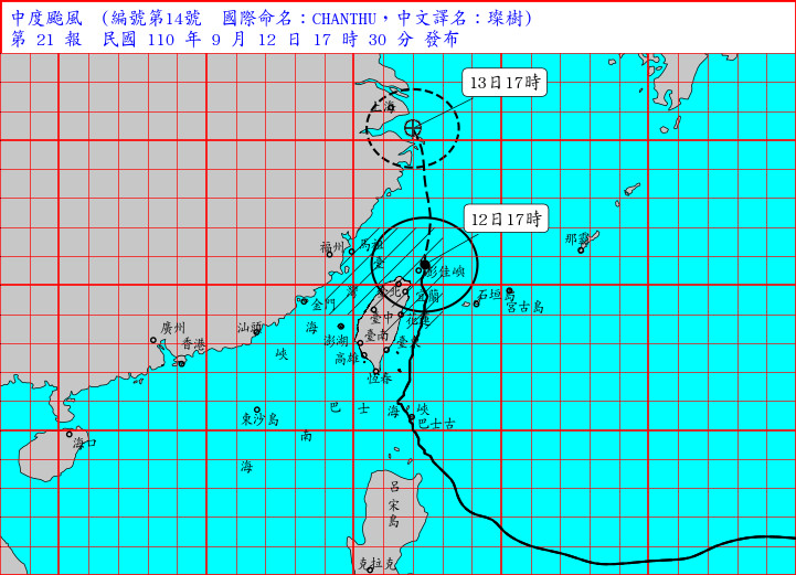 根據中央氣象局資訊,今天(9/12)17時30分,璨樹颱風相對位置已來到台北東北方約120公里海面上,其速度稍微變慢,以每小時14公里持續往北轉北北西前進。隨颱風逐漸加速,台灣將漸漸脫離暴風圈,彰化、南投至台東已經脫離路上警報範圍,預計今天晚上至午夜,有機會解除陸上颱風警報;午夜到明天清晨,可能解除海上警報。實際情況將視颱風動態而定。
