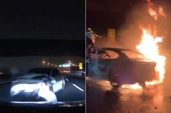 這起事件發生在12日凌晨,當時28歲的林男駕車於上述路段,因不明原因自撞內側護欄,車子彈飛到中線車道,而後方的陳男因視線因素,根本來不及剎車,就直接追撞上去,從畫面中也可見,當時天色昏暗、視線不清,當陳男看到前方車輛的時候,根本已經來不及做出反應,而之後巨大的撞擊力道也讓林男的車子瞬間燒成火球。