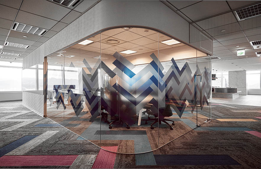 設計師以早期老一輩電腦開機的馬賽克圖案,以及0與1的語言為發想,將相疊的三角形使用在地毯、窗貼上,並搭配方塊、幾何的線條,延伸出簡潔有力的現代感。會議室使用了金屬框加上玻璃,並飾以桃紅、藍色、綠色等色系的三角形拼貼元素,與地毯以顏色做出的人字拼相呼應;刻意降低使用色彩的彩度,在幾何圖形的色彩與搭配上,力求花俏又不紊亂,營造出既年輕有活力,又高質感的舒適優雅。