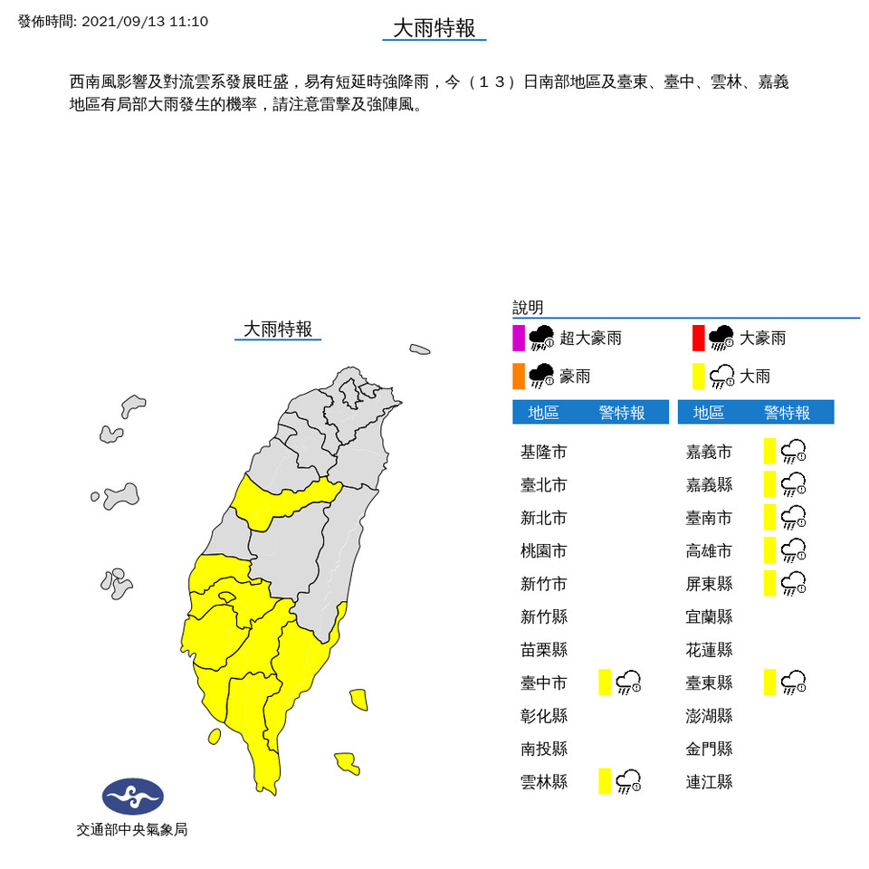西南風影響及對流雲系發展旺盛,易有短延時強降雨,今(9/13)日南部地區及臺東、臺中、雲林、嘉義地區有局部大雨發生的機率,請注意雷擊及強陣風。氣象局也持續針對「屏東縣、臺東縣」發布大雷雨即時訊息,持續時間至12時00分止。