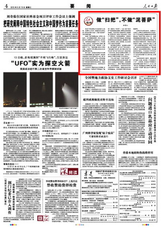 中共中央委員會機關報《人民日報》是中國第一大報,被聯合國教科文組織評為世界最具權威、最有影響力的十大報之一,與新華社、中央電視台並列中國官方三大傳媒。15日由青海省委常委曲青山寫的「做『掃把』,不做『泥菩薩』」一文,引中華人民共和國開國元勛彭德懷所言,「我們要像掃把一樣供人民使用,而不要像泥菩薩一樣讓人民恭敬我們。」