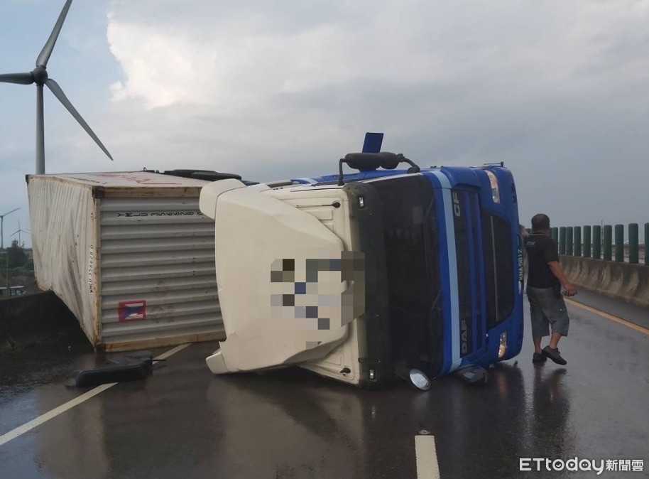 ▲西濱道路下午發生貨櫃車翻覆意外。(圖/記者白珈陽翻攝)