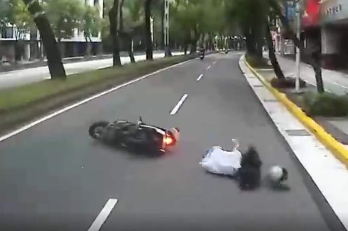 北市1名女騎士,14日清晨時分騎車行經中山北路、農安街口,卻突然自摔倒地,過程都被後方騎士的行車紀錄器拍下,當時女騎士整個人噴飛、安全帽掉落一旁,趴在地上動彈不得,後方騎士趕緊下車協助。