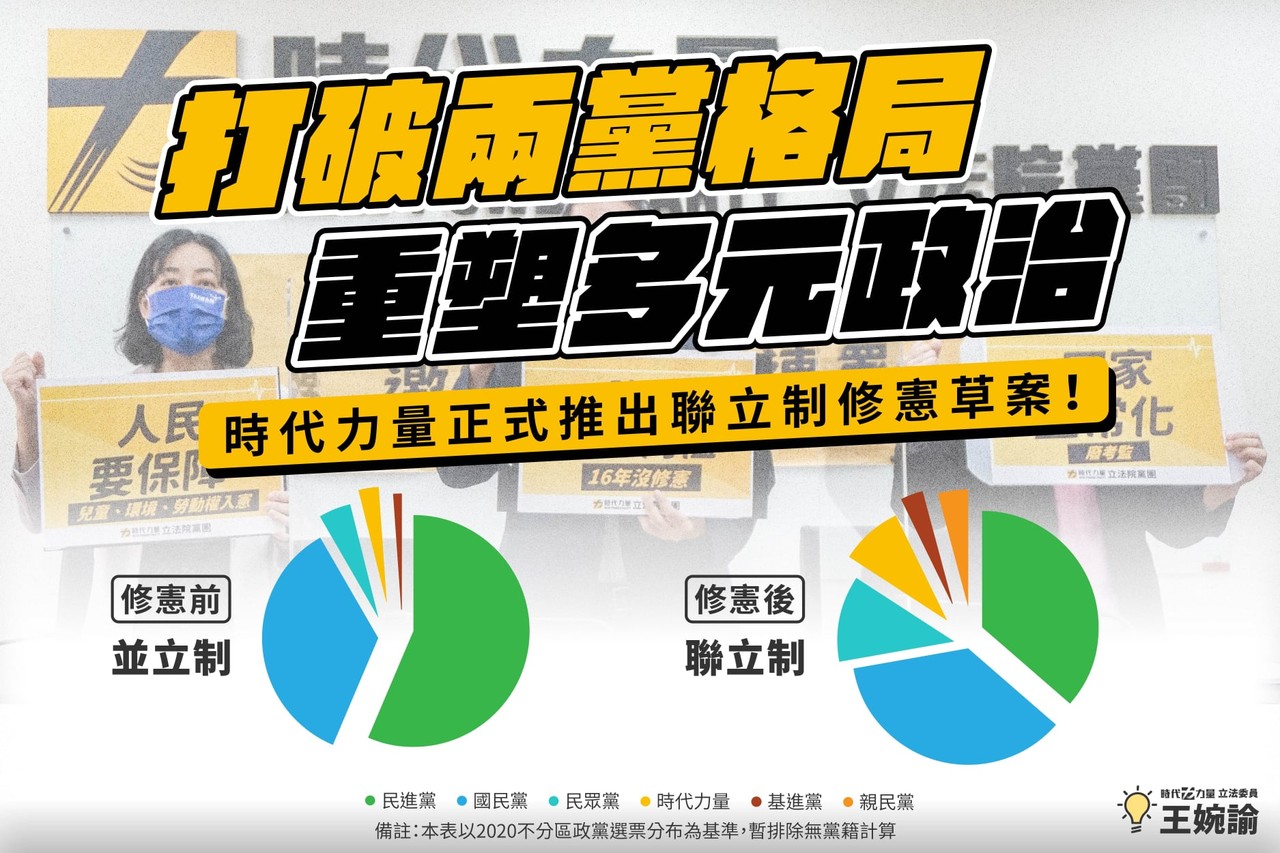 自2008年的立委選舉開始,台灣採用「單一選區兩票並立制」,時常遭在野黨抨擊過於傾向大黨。時代力量立委王婉諭14日臉書宣布,時代力量正式推出聯立制修憲草案,讓更多元的聲音能夠進入國會。