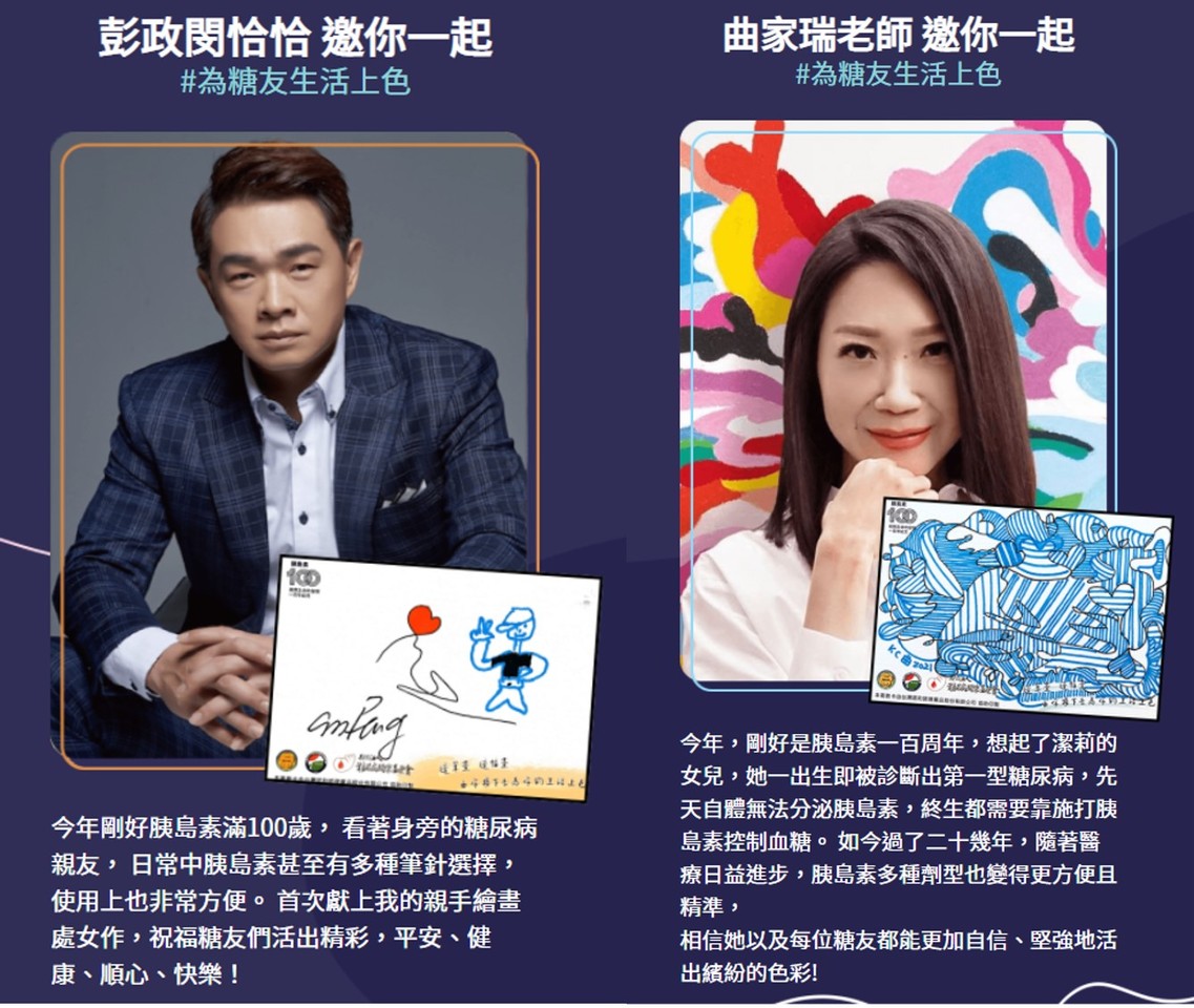 胰島素工藝的百年演進當中,注射器改良出筆針形式更是一大創舉,使糖尿病治療得以融入病友生活,讓病友更無負擔地活出人生色彩。社團法人中華民國糖尿病學會、社團法人中華民國糖尿病衛教學會、財團法人糖尿病關懷基金會三大團體共同辦理「胰島素100周年 讓糖友為生活上色」線上繪畫活動。本次活動,跨界邀請藝術家曲家瑞及職棒球星彭政閔恰恰,率先為活動敲響第一炮,透過繪畫傳遞正向的美好!