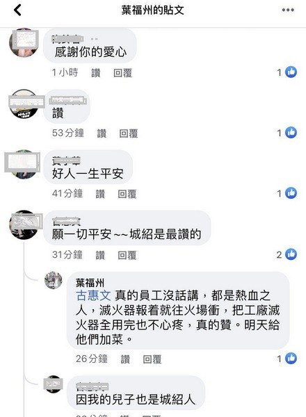 葉福州於臉書表示,雖便當比預定時間慢到客戶手中,但客戶獲悉是為救火,未見責怪還暖回「好心有好報!」葉福州說,該起火燒車事故,發生於今天近午楊梅區中山南路(花彩節入口處)的車禍,當時他因送便當經過撞見,原本還以為不嚴重,怎知道不到5分鐘時間,被撞擊車子的車頭就冒出火來,還好傷者也在這時被消防員救出(昏迷現場cpr)。