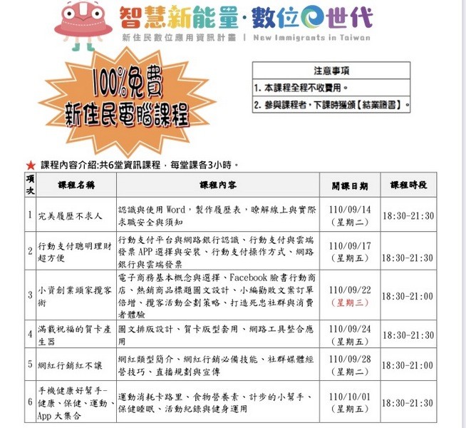 林桂金說,「新住民免費電腦課程」利用晚間上課,於9月14日起在巨匠電腦桃園認證分校陸續開課,共有6堂課程,課程內容包括:完美履歷不求人、小資創業頭家攬客術及網紅行銷紅不讓…等多項實用的電腦課程。在疫情期間仍吸引了近20位的新住民姐妹及新二代報名參與,相當難得。