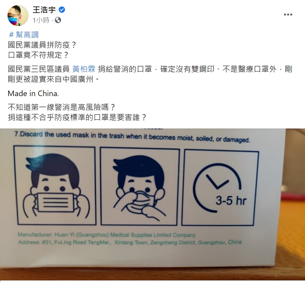 王浩宇指控,「國民黨議員拼防疫?口罩竟不符規定?」,國民黨三民區議員 黃柏霖 捐給警消的口罩,確定沒有雙鋼印、不是醫療口罩外,剛剛更被證實來自中國廣州,「不知道第一線警消是高風險嗎? 捐這種不合乎防疫標準的口罩是要害誰」?