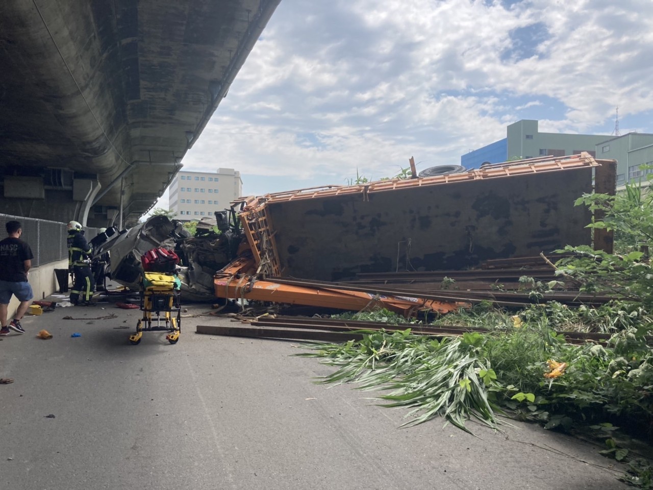 台中市國道4號神岡段16日上午10時14分發生一起嚴重車禍!一輛載有鋼構的大型吊臂車與道路一輛轎車發生碰撞,轎車後半部全毀,吊臂車則是從國道4號翻落10多公尺的平面道路,吊臂車駕駛受困車內,經消防人員救出時,駕駛手腳骨折,滿嘴是血,無法清楚說明事發過。國道警察則表示,事故當時轎車是靜止或是行進間,還有待釐清。