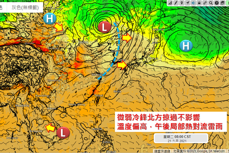 吳聖宇指出,下周二中秋節當天,北方有微弱鋒面要通過,位置偏北,看起來應該是不至於直接影響台灣天氣,但是由於伴隨西風短波槽通過,太平洋高壓勢力也會略為減弱,午後熱對流發展有可能會增多一些,鋒面移動的位置仍有變化的可能性,是否會再往南延伸一點更靠近台灣,值得觀察。