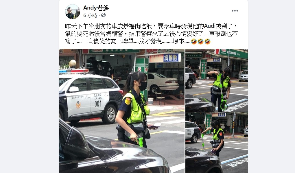 「Andy老爹」16日透過臉書發文、他當時搭友人Audi休旅車到北市文山路景福街用餐,餐聚結束後發現愛車被刮,友人心痛報警求助、文山二交通分隊女警到場,兩人見到女警清秀外型及熱心服務態度「壞心情瞬間被融化!」Andy老爹指出,友人還邊傻笑編寫三聯單「正妹女警擄獲友人的心!」