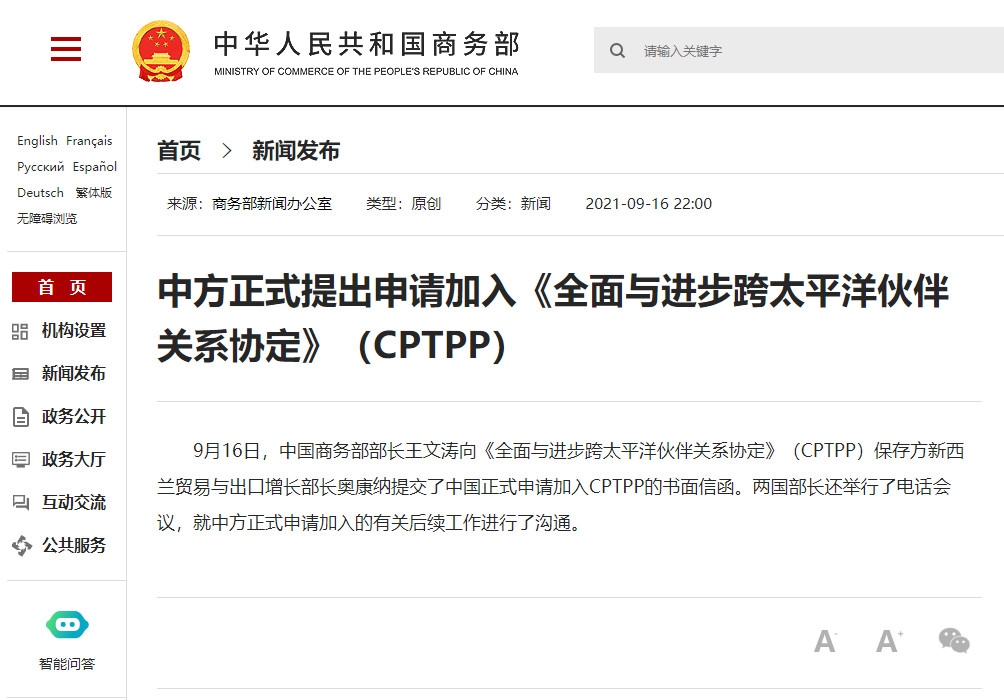 根據中國商務部最新消息,商務部部長王文濤16日向《全面與進步跨太平洋夥伴關係協定》(CPTPP)保存方紐西蘭貿易部長奧康納(Damien O'Connor)提交正式申請加入CPTPP的書面信函。另外,中紐雙方還進行電話會議,就中國正式申請加入的後續工作進行了溝通。