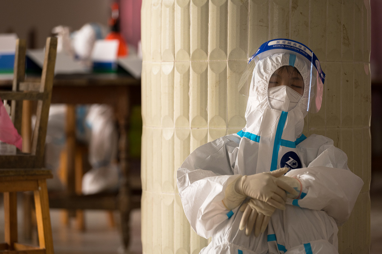 ▲雲南醫護人員於核酸檢測採檢點休息。(圖/CFP)