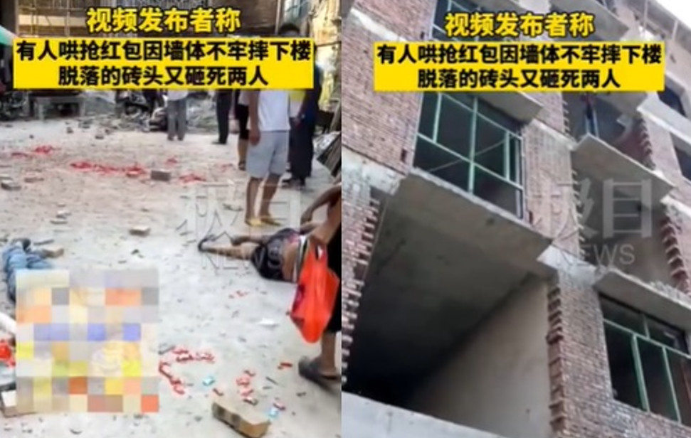 湖南邵陽一名屋主為了慶祝新屋建成,開心在屋頂上撒紅包,沒想到卻引發命案,1人為了搶紅包不小心墜樓身亡、2人被脫落的磚塊砸中身亡,3人受傷,目前屋主與工頭已被警方控制調查中。