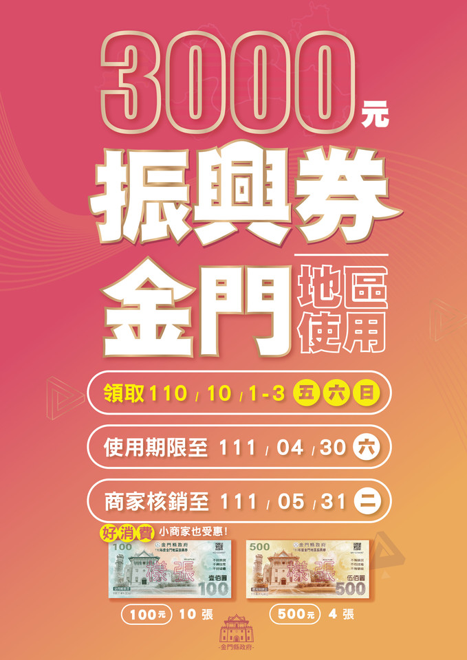 金門「110年度振興券」敲定10月1日開始發放,縣長楊鎮浯昨偕副縣長李增財、建設處長陳祥麟、財政處長孫國智及民政處長蔡西湖召開記者會表示,今年考量疫情情況,民眾荷包緊縮,所以縣府經過內部討論後決定逕發民眾價值新臺幣3千元振興券,而且為造福地區小型商家,新增加面額100元振興券,每份由10張面額100元及4張面額500元組成,預期可帶動地區至少新臺幣4.2億消費產值。