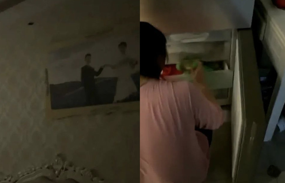 進門之後,很快有一名身穿粉紅色睡衣的人妻走來熱情招待,還準備了一杯飲料給男網友喝。但最扯的是,男網友故意將鏡頭往四周擺動時,竟拍到了牆上人妻與元配丈夫的婚紗照。