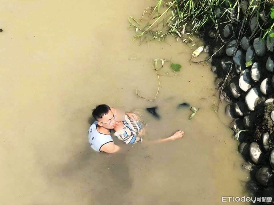 ▲老翁自撞落水,正面朝下載浮載沉,警員黃承鋐見狀立即脫下警服縱身一跳躍入水中救人。(圖/記者蔡佩旻翻攝)