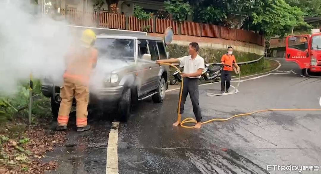 ▲1名呂姓民眾駕駛新購之汽車至山區試車,不料於172線粗坑道路上,疑因引擎機械問題車輛冒濃煙,警方通知消防隊到場撲滅火勢,虛驚一場。(圖/記者林悅翻攝,下同)