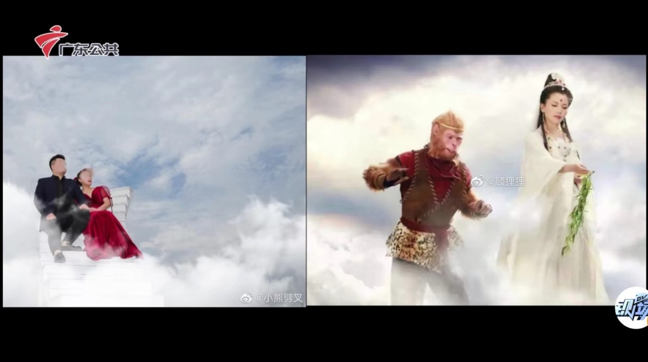 毒舌的網友紛紛留言,「拍得很好,下次結婚不要拍了」、「神仙之中帶著一點土,土中又有神仙,可能是土地公」、「婚紗照翻車現場,拍出了西遊記的感覺」、「可能象徵著上天堂還要在一起?!」,還有人將照片拿來和《西遊記》劇照做對比圖。