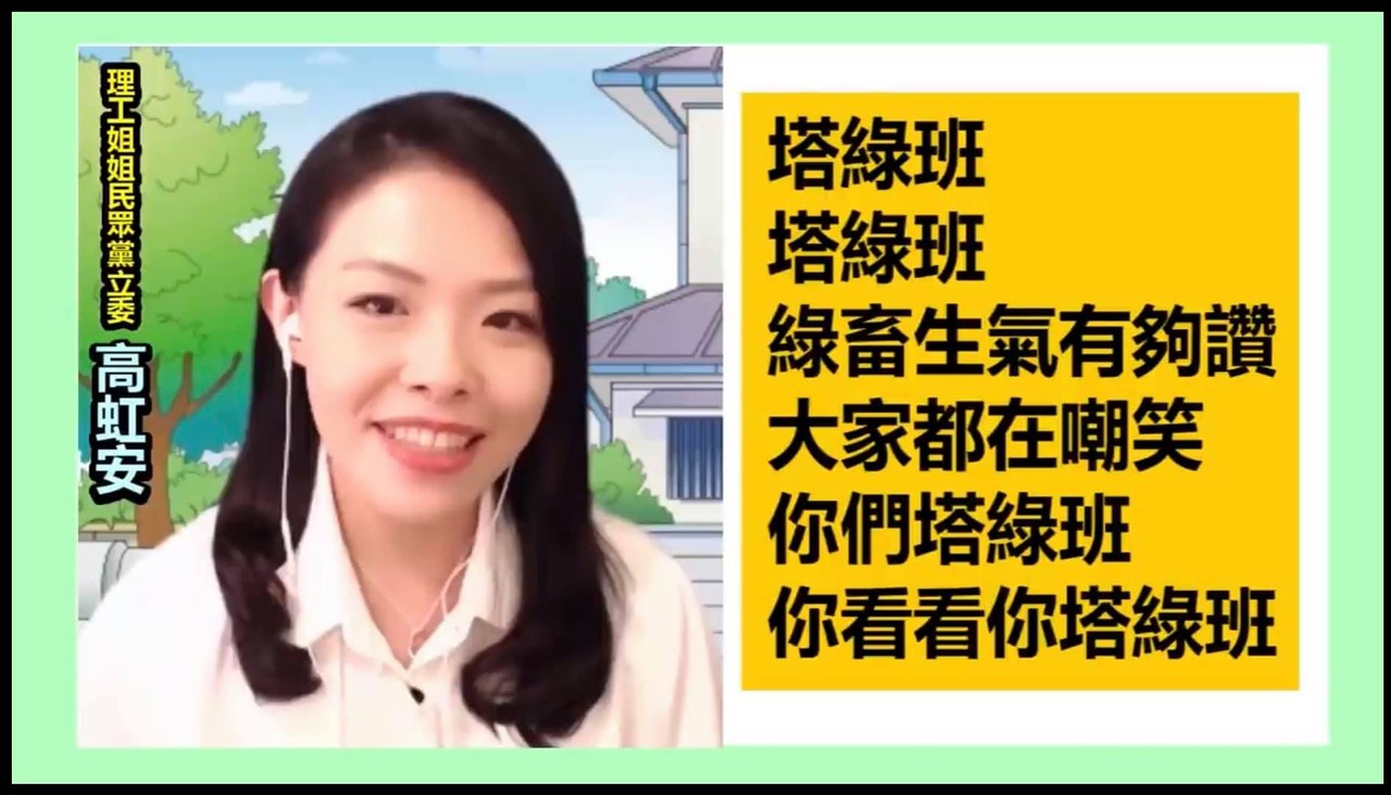 名嘴「宅神」朱學恒製作用以譏諷民進黨支持者的塔綠班之歌,還找來民眾黨立委高虹安和資深媒體人黃暐瀚合作獻唱,歌詞中直接開罵「綠畜」,對此,民進黨新竹市黨部20日表示,國會議員代表民意在國會殿堂發聲,網路平台上這些訕笑詞彙,實在應該慎之,「政治人物,謹言慎行是最基本。」