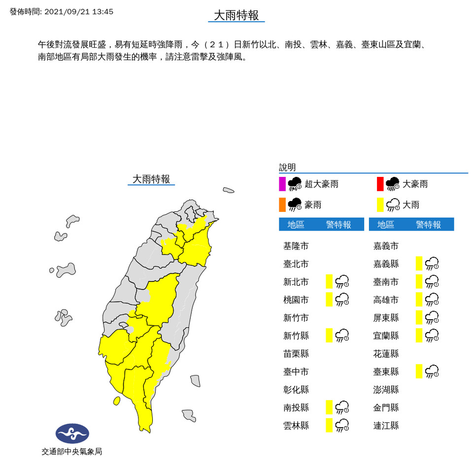 今天(9/21)為中秋連假最後一天,但午後要出遊、返回工作崗位的民眾務必留意了。受午後對流發展旺盛影響,易有短延時強降雨,氣象局今已針對11縣市發布大雨特報,新竹以北、南投、雲林、嘉義、臺東山區及宜蘭、南部地區有局部大雨發生的機率,請注意雷擊及強陣風。並針對「新北市、桃園市、宜蘭縣」發布大雷雨即時訊息,持續時間至15時止。