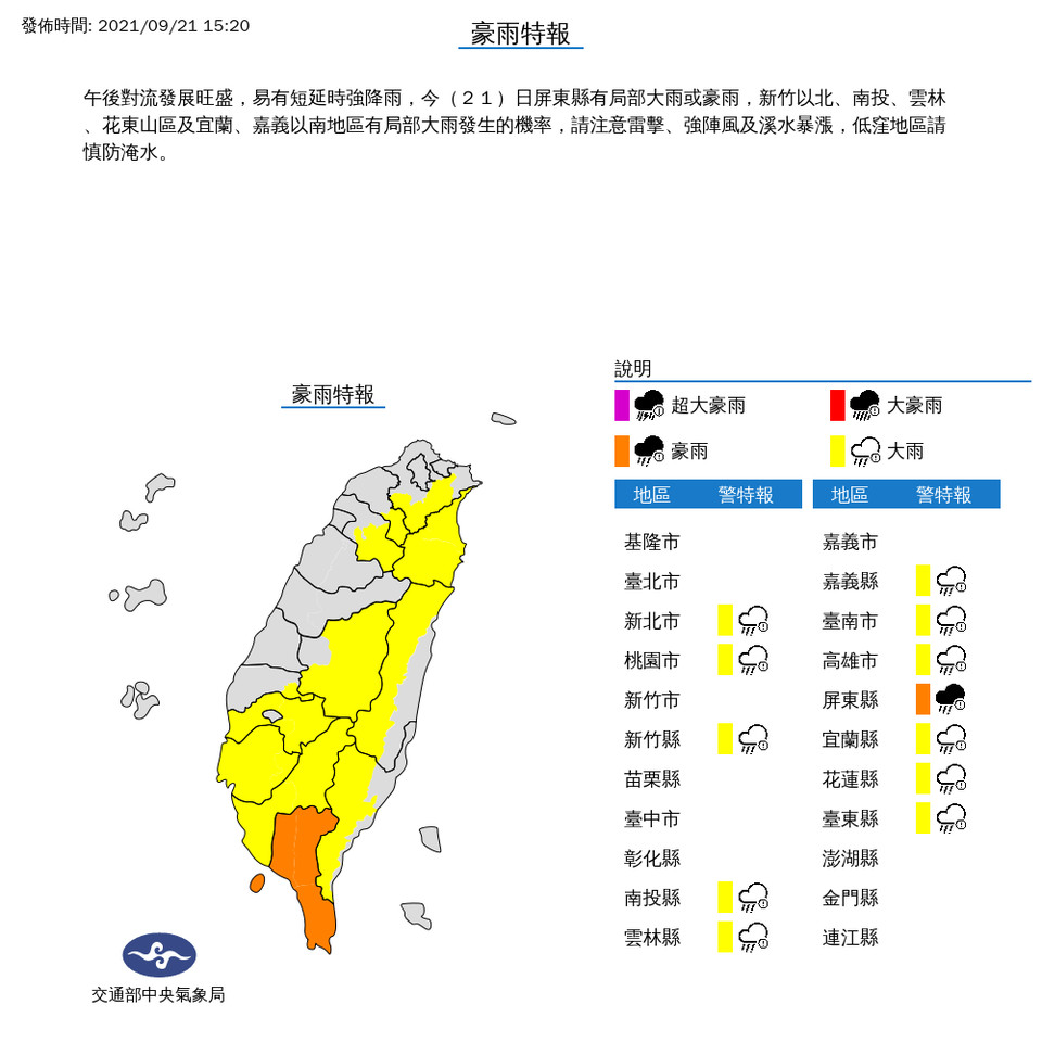 根據中央氣象局資訊,今(9/21)受午後對流影響,氣象局稍早已針對12縣市發布大雨至豪雨特報,並針對屏東縣發布豪雨特報。今日屏東縣有局部大雨或豪雨,新竹以北、南投、雲林、花東山區及宜蘭、嘉義以南地區有局部大雨發生的機率,請注意雷擊、強陣風及溪水暴漲,低窪地區請慎防淹水。
