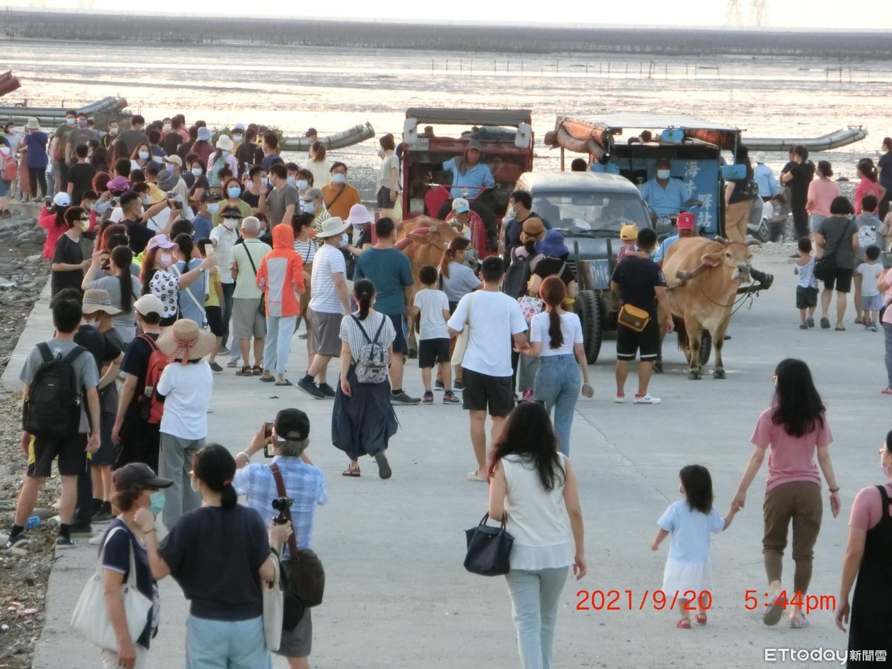 海牛學校校長魏清水說,中秋假期4天每天都有數千人湧入芳苑鄉,乘坐牛車出海探索蚵田生態,分上下午2場次,2小時一班車,大約可以來回5趟,進場的民眾都有做人流管況。