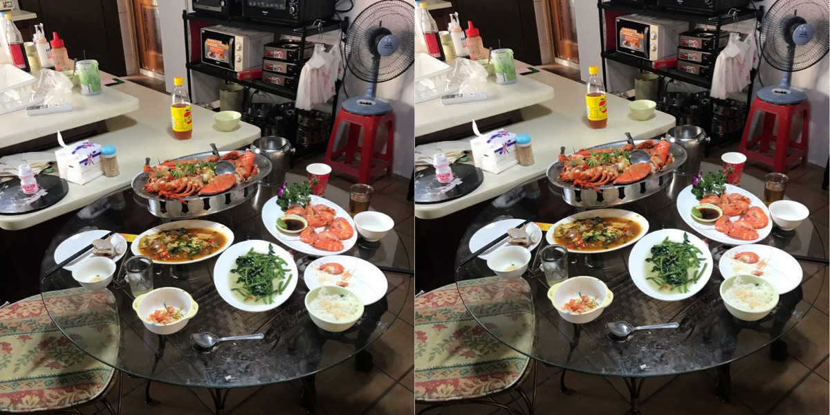 原PO見一家三口離去後,便好奇探頭一看,由於滿桌好料,讓原PO內心陷入掙扎直呼,「現在龍蝦還在桌上,服務人員也不知道要不要收,只點了炒麵跟蚵仔酥的我,該怎麼辦?」
