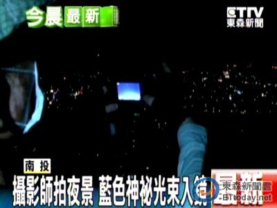 南投縣埔里鎮有兩名攝影玩家13日晚間在虎頭山拍夜景,意外拍到一道藍色光束,回家之後PO在網路,有人說像飛碟、火箭,也有人說是極光,就連詢問攝影專家也無法解釋這道藍色光束究竟是什麼東西。