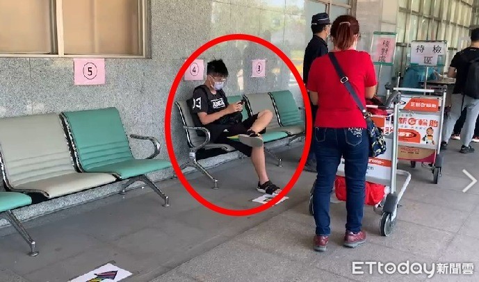 ▲金門大學生入境拒絕快篩,翹腳滑手機與駐站人員僵持不下。(圖/記者林名揚翻攝)