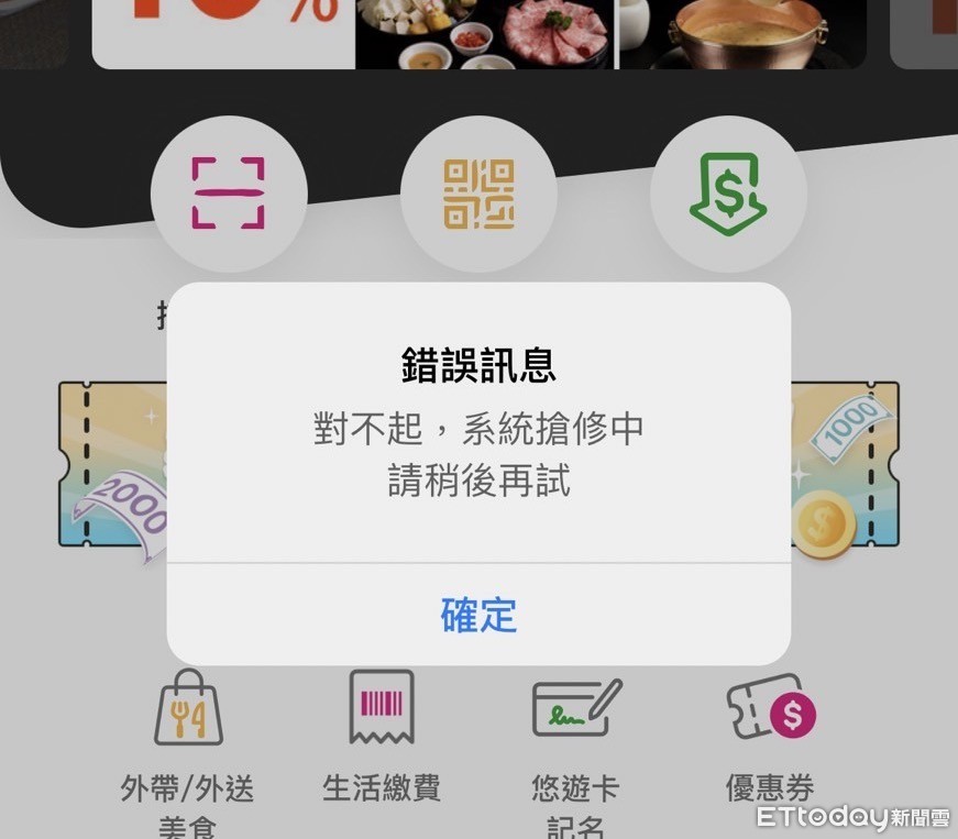 台北市政府與悠遊卡公司透過「悠遊付」APP推加碼活動,面對五倍券22日上午9時開放數位綁定,大批民眾搶登「悠遊付」APP,造成「悠遊付」一度當機,顯示「對不起,系統搶修中,請稍後再試」等文字。